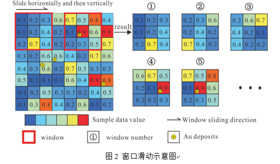 通过窗口滑动进行数据增强获取样本数据(图2),并采用卷积神经网络(CNN)提取窗口的数据特征,每个窗口的网格数据可看成一幅包括地质、化探、物探信息的多通道图像,再通过样本随机配对方式构建训练和验证样本数据集,进一步增强数据集。