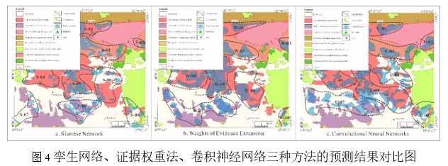 该方法经在河北张家口崇礼矿集区进行金矿找矿应用,并与证据权重法及卷积神经网络(CNN)模型的预测结果对比(图4)得出:(a)孪生网络模型的预测效果优于卷积神经网络(CNN)模型,明显优于证据权重(WOE)方法;(b)预测结果与研究区地质成矿特征及已知矿床高度吻合。