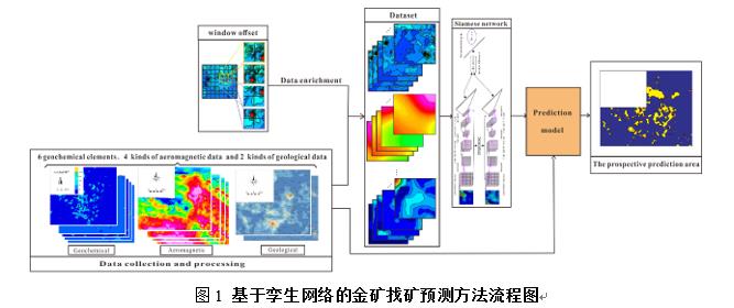 孪生网络是一种基于度量的元学习网络,元学习可以学会学习:即用过去的知识和经验来指导新任务的学习。与常规神经网络的不同是:孪生网络输入的是一对样本,能够通过衡量输入样本的相似性从新样本中自动发现泛化特征。该网络应用于矿产勘察领域进行找矿的主要步骤(图1)如下: