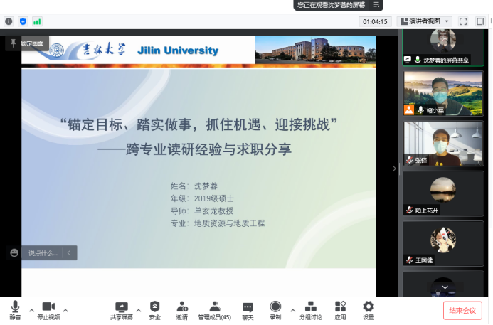 非传统地质专业的一名跨考研究生,通过自身三年的努力学习,成功签约了中海油深圳公司。她从跨专业就业的角度,以《锚定目标、踏实做事、抓住机遇、迎接挑战——跨专业读研经验与求职分享》为题,围绕跨专业读研经历、“升学or就业?”及“笔试and面试”这三方面与大家分享了自己的学习、科研及求职经验。她表示,跨专业的学生更要注重学科研究基础思维的建立,要积极参与科研项目,注重团队合作,主动与团队中老师和师兄师姐请教交流,提高自己的专业素养,为对口就业做好准备。在面对未来选择的迷茫时,沈梦蓉建议大家考虑未来人生规划、当前阶段性目标以及长远的人生方向,充分考虑个人能力,开拓就业视野,最终实现成功就业。