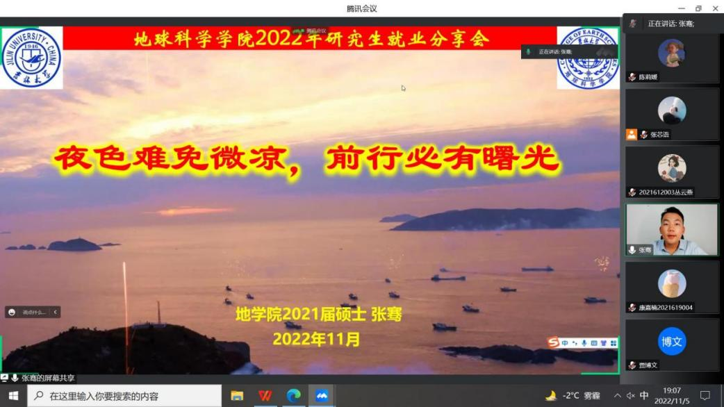 在经济形势和就业形势依旧严峻,地学趋冷的大背景下,同学们要如何实现高质量就业?分享会伊始,现在中海油研究总院工作的张骞有针对性地向同学们介绍了当前的就业形势,希望通过自己的求职经历和经验,帮助同学们在求职过程中少走弯路,顺利就业。