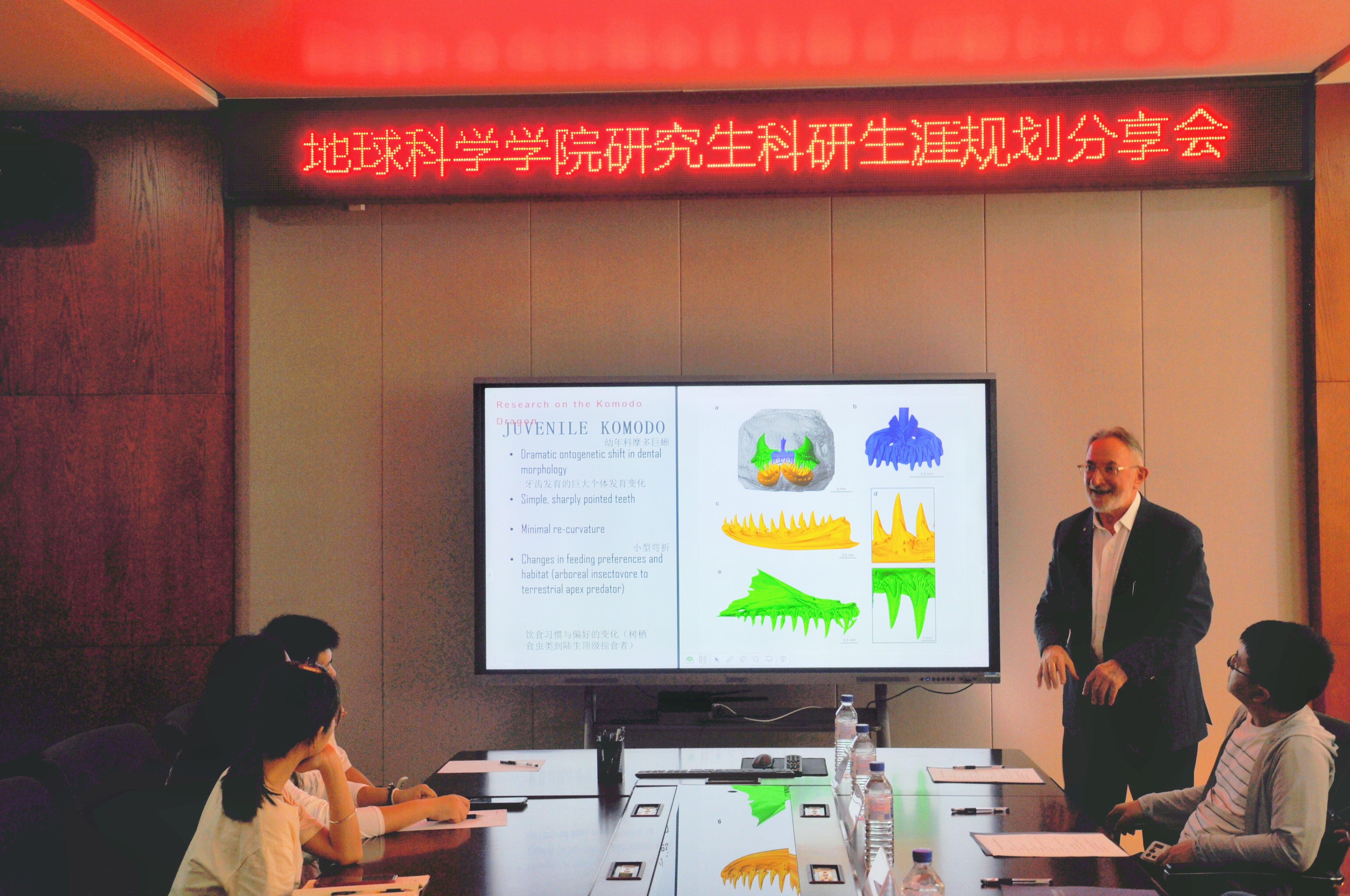 外聘杰出教授、恐龙演化研究中心名誉主任罗伯特·赖兹教授在鸽子楼109-2会议室开展研究生科研生涯规划分享会。活动由党委副书记马旭主持,豪神娱乐城