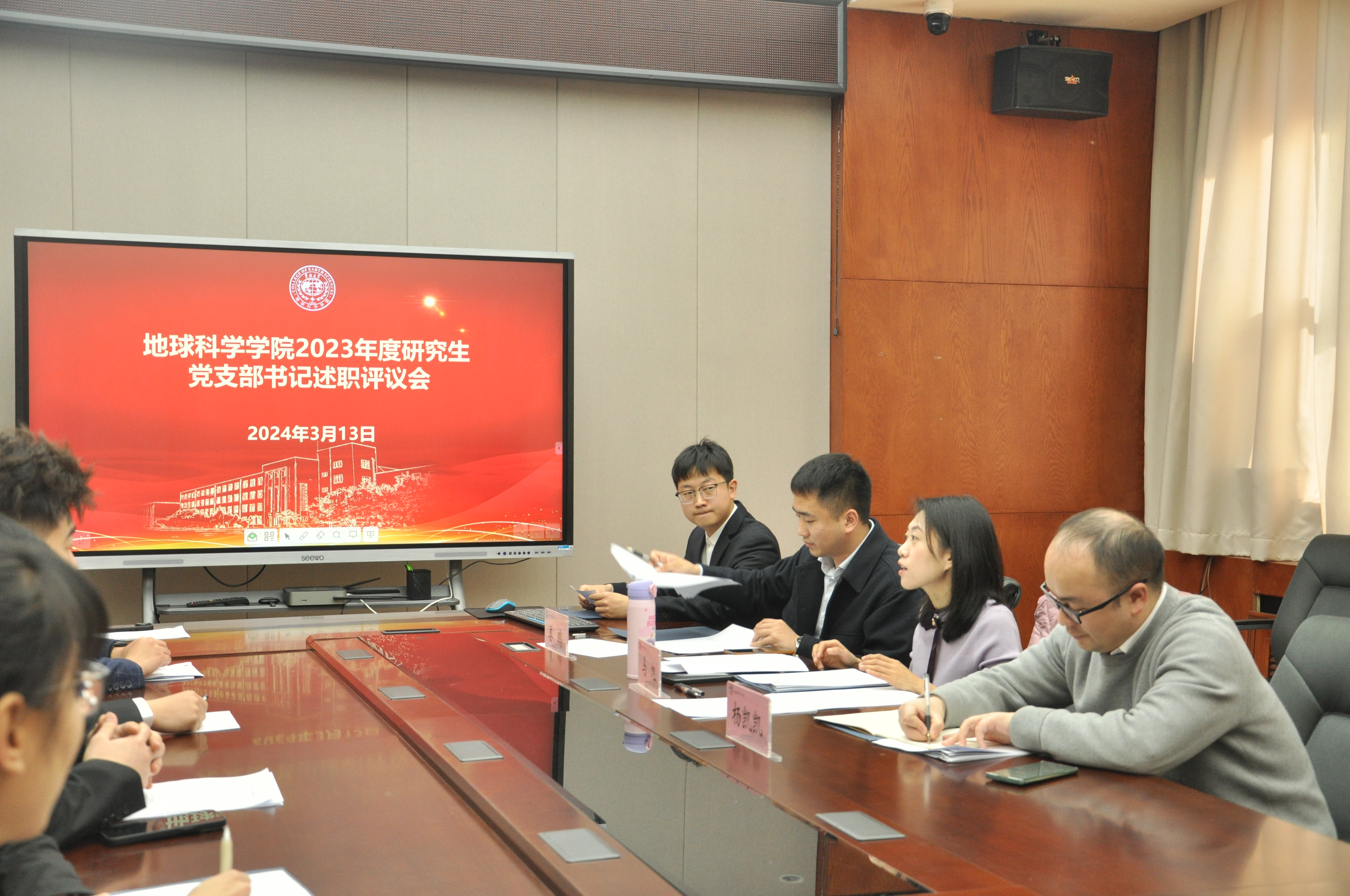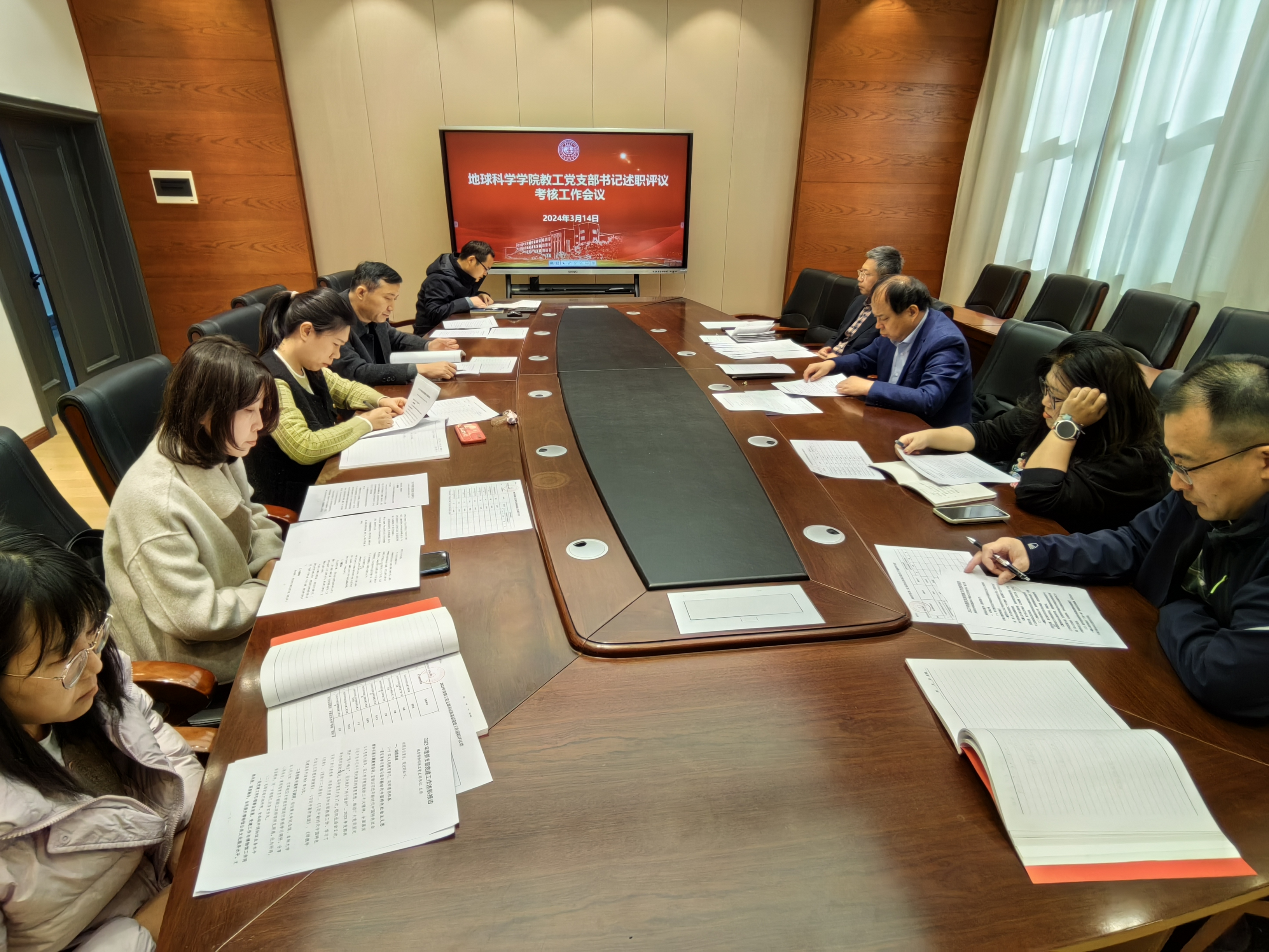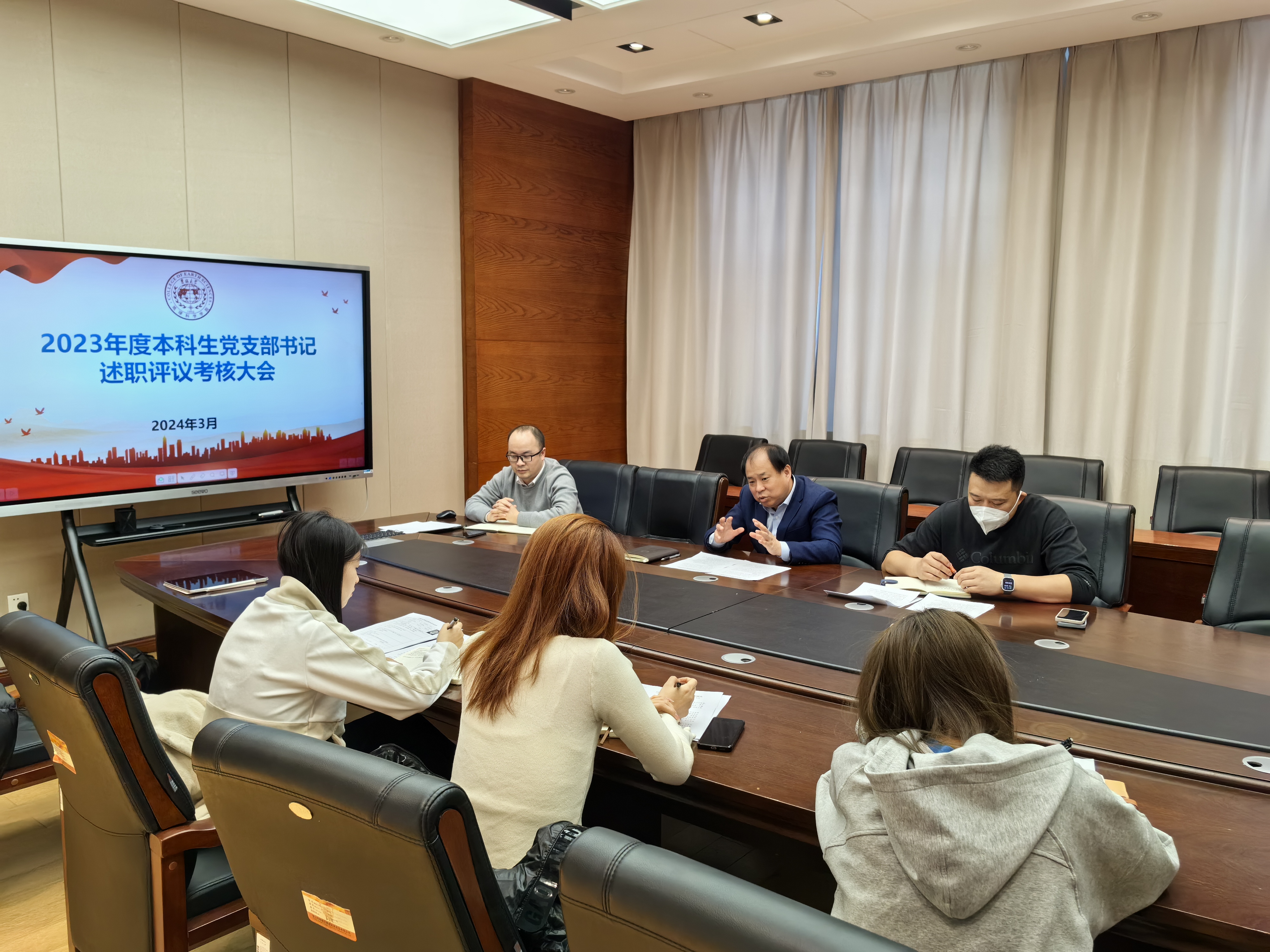 党委于鸽子楼组织开展了2023年度党支部书记述职评议考核工作。本次述职评议考核分三场进行,教工党支部书记述职由杨洲书记主持;本科生党支部书记述职由李阳副书记主持,杨洲书记参加会议;研究生党支部书记述职由马旭副书记主持。