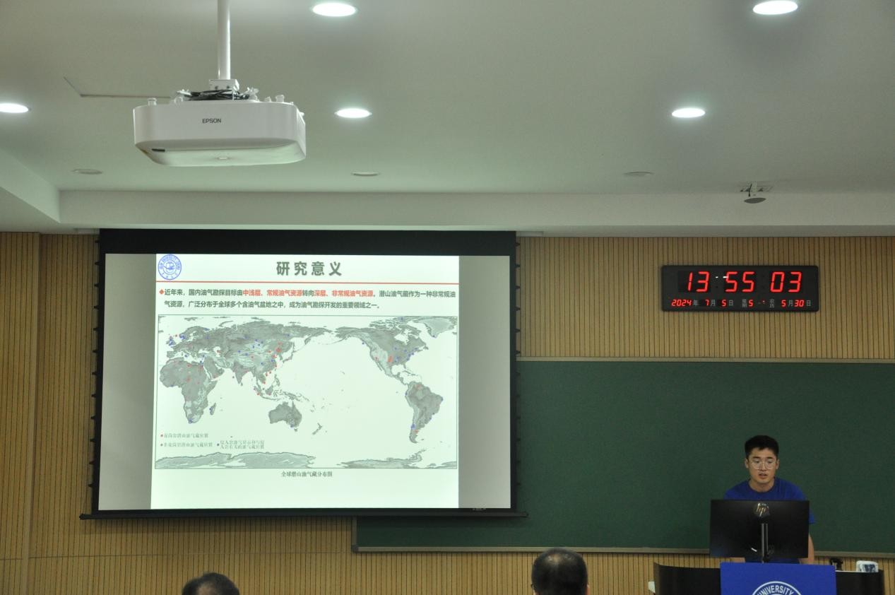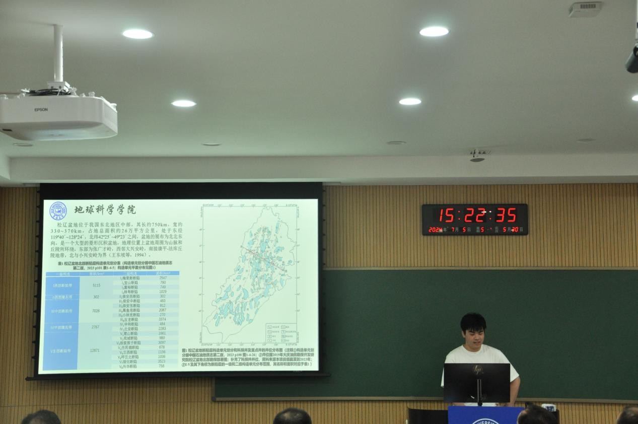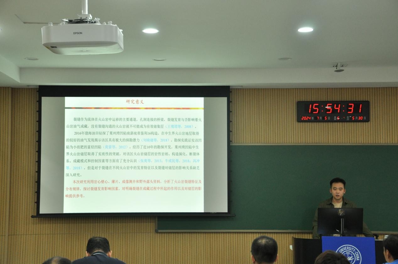 活动上,田志文同学探讨了南海北部中生代花岗岩潜山的成岩过程和成山演化,以及这些过程如何塑造了其独特的储层特征;武海超同学则聚焦于福建省东北部的中生代花岗岩风化松散物,揭示了其压实减孔特性及其背后的控制因素;孙宁远同学分享了他在松辽盆地古龙页岩有机-黏土复合体结构特征方面的发现;唐鑫同学对松辽盆地及其邻区2009年至2024年的地震数据进行了的统计和分析,为我们提供了该地区地震活动性的时间序列特征和空间分布模式。包金锐同学则对松辽盆地南部龙凤山气田火石岭组火山碎屑岩中的绿泥石进行了研究,探讨了其分布特征及其对储层性能的影响;高传承同学介绍了松辽盆地国际大陆科学钻探松科2井的完钻井深,以及7000至7108米井底的岩性特征;卞海越同学研究了辽西下白垩统义县组火山岩的储层特征,揭示了该地区火山岩储层的形成和演化机制;王庶丞同学分析了渤海湾盆地莱州湾凹陷南斜坡中生界火山岩S井区的裂缝特征及其分布规律,为该地区的地质结构和油气储层的分布提供了新的见解;张津铭同学分享了他在辽西地区下白垩统义县组火山岩相模式研究中的成果。