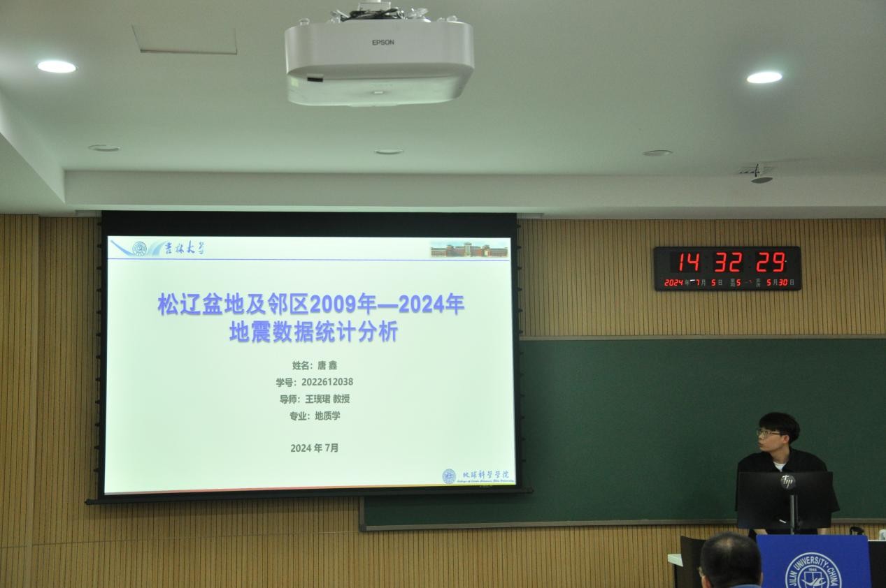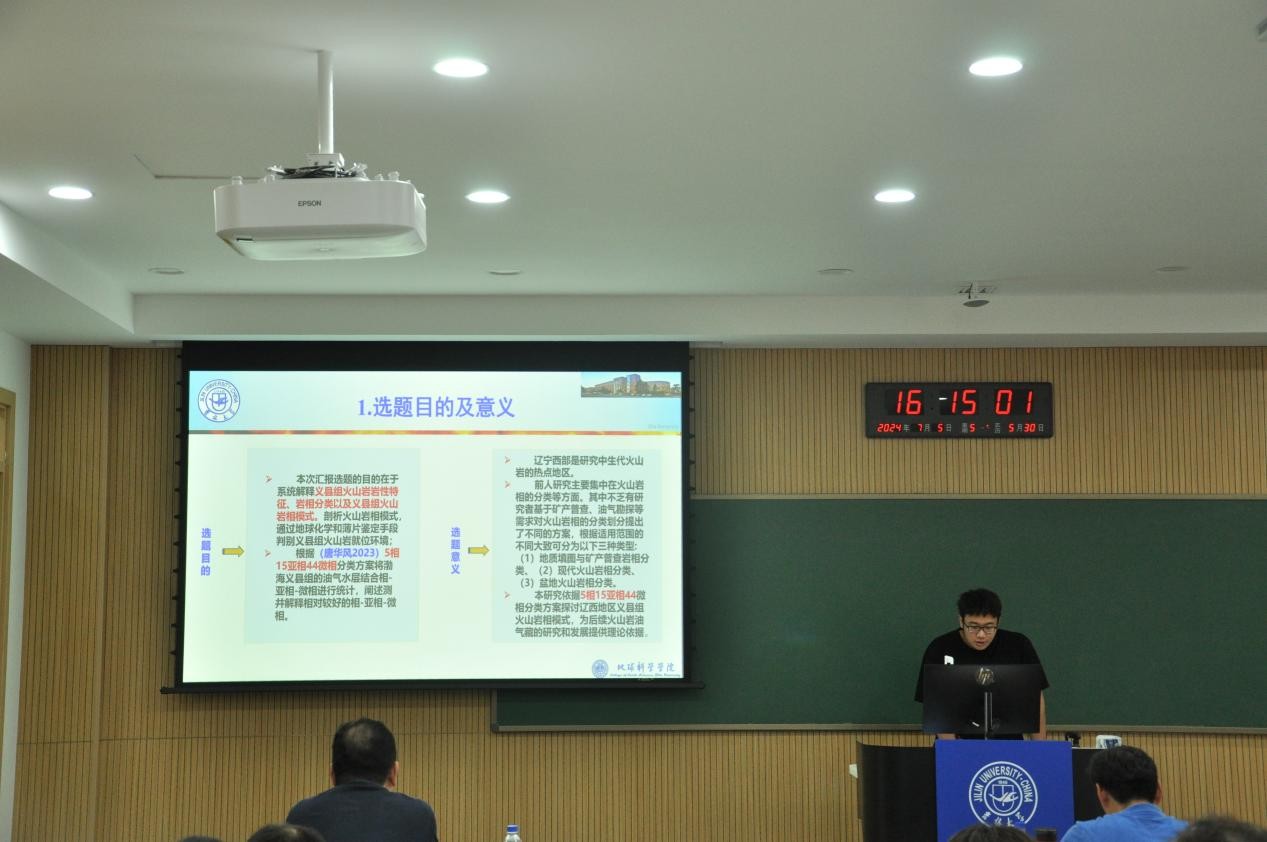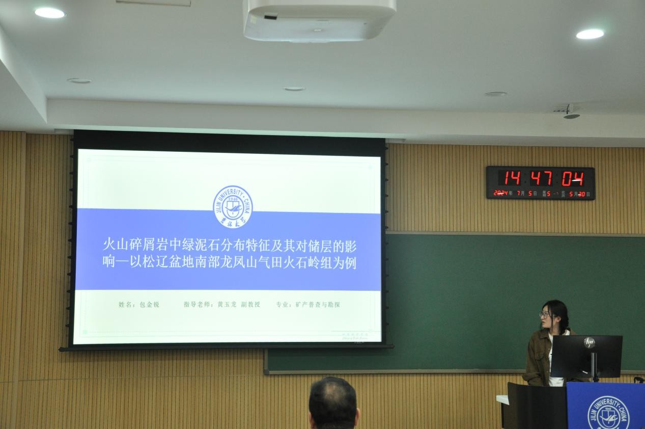 活动上,田志文同学探讨了南海北部中生代花岗岩潜山的成岩过程和成山演化,以及这些过程如何塑造了其独特的储层特征;武海超同学则聚焦于福建省东北部的中生代花岗岩风化松散物,揭示了其压实减孔特性及其背后的控制因素;孙宁远同学分享了他在松辽盆地古龙页岩有机-黏土复合体结构特征方面的发现;唐鑫同学对松辽盆地及其邻区2009年至2024年的地震数据进行了的统计和分析,为我们提供了该地区地震活动性的时间序列特征和空间分布模式。包金锐同学则对松辽盆地南部龙凤山气田火石岭组火山碎屑岩中的绿泥石进行了研究,探讨了其分布特征及其对储层性能的影响;高传承同学介绍了松辽盆地国际大陆科学钻探松科2井的完钻井深,以及7000至7108米井底的岩性特征;卞海越同学研究了辽西下白垩统义县组火山岩的储层特征,揭示了该地区火山岩储层的形成和演化机制;王庶丞同学分析了渤海湾盆地莱州湾凹陷南斜坡中生界火山岩S井区的裂缝特征及其分布规律,为该地区的地质结构和油气储层的分布提供了新的见解;张津铭同学分享了他在辽西地区下白垩统义县组火山岩相模式研究中的成果。