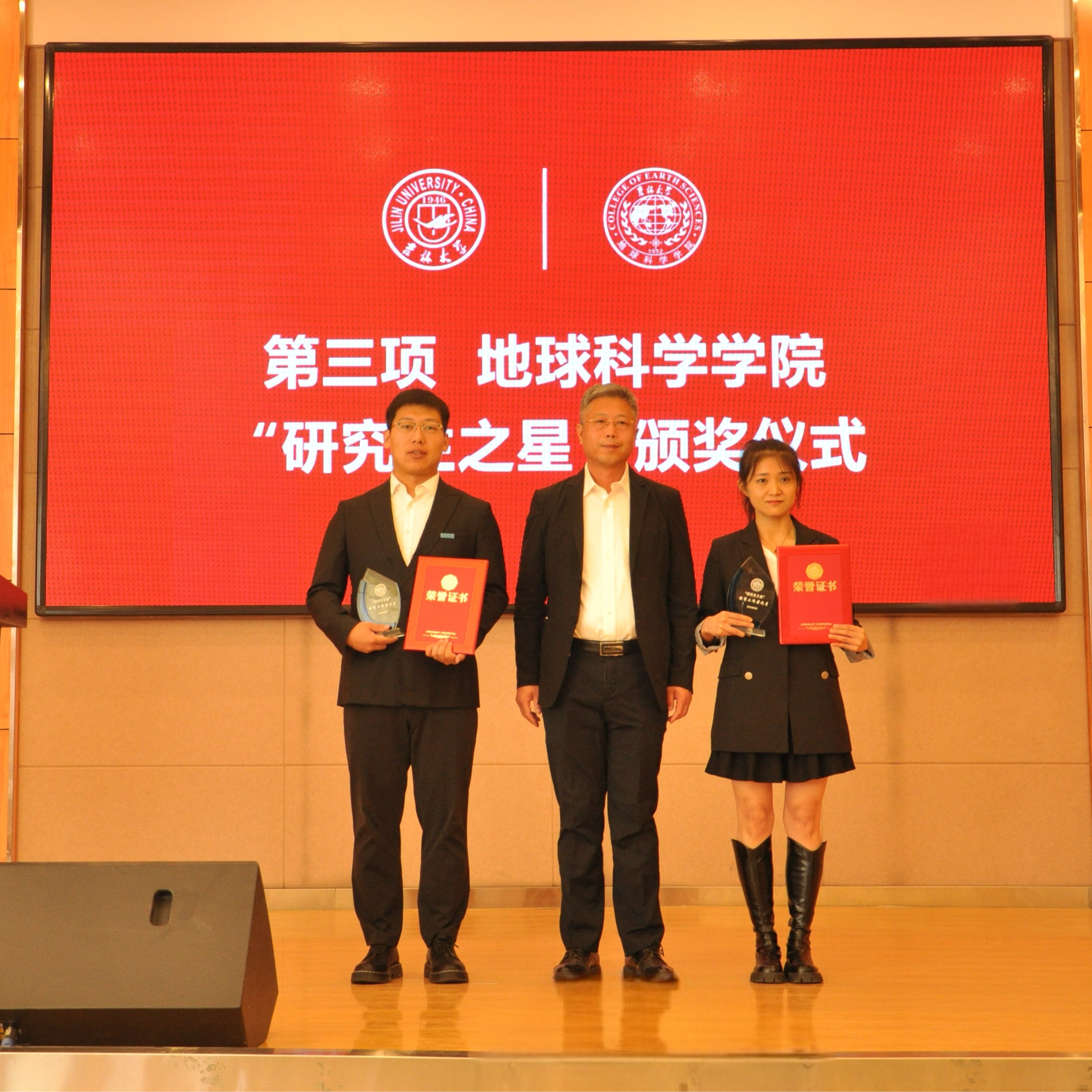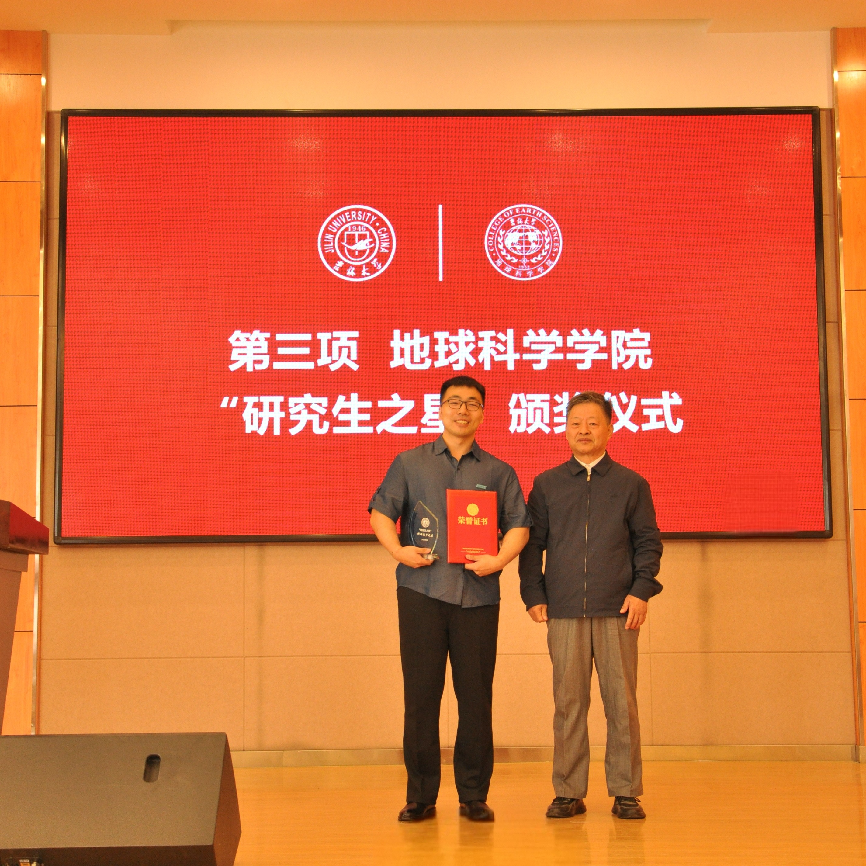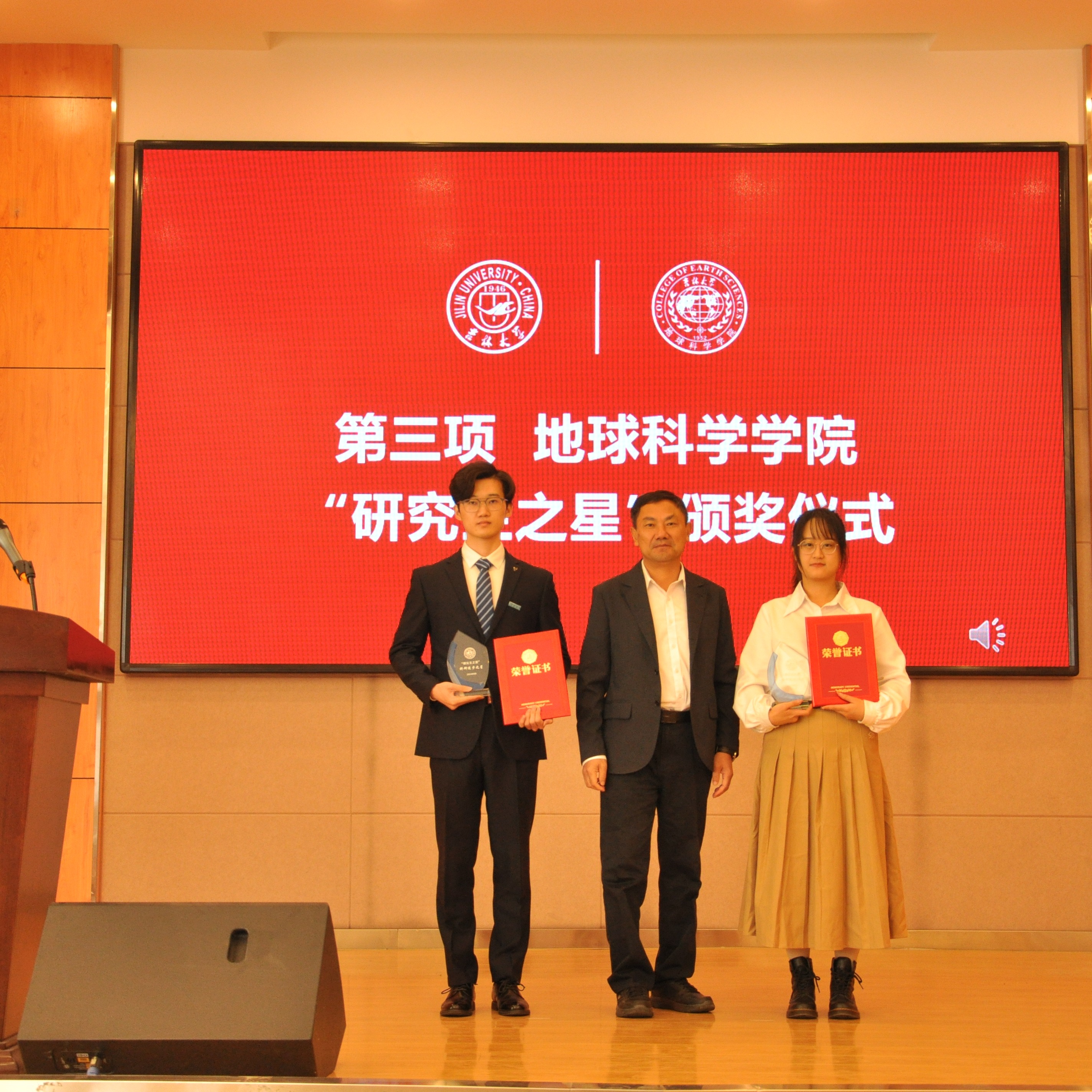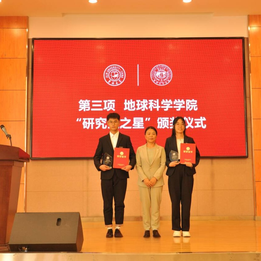 院长单玄龙,专业学位培养指导委员会主任委员王璞珺、行政副院长苗广文、地质学系主任李世超、国土资源系主任王冬艳、博士生导师杨晨分别为“研究生之星”颁发荣誉证书和奖杯。