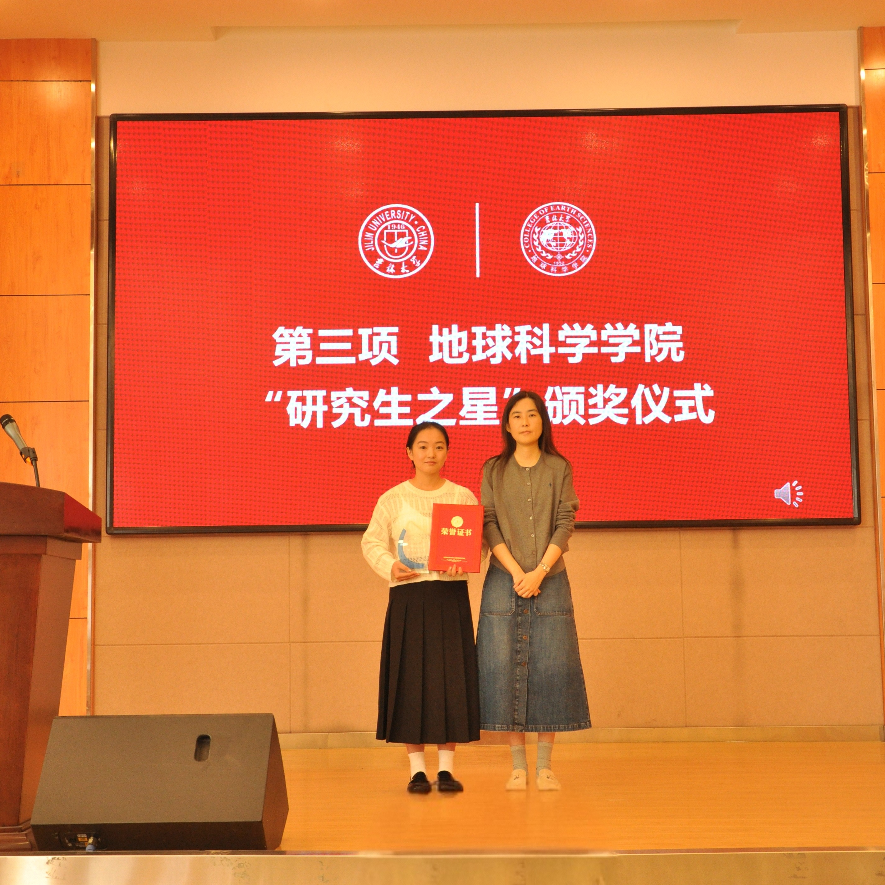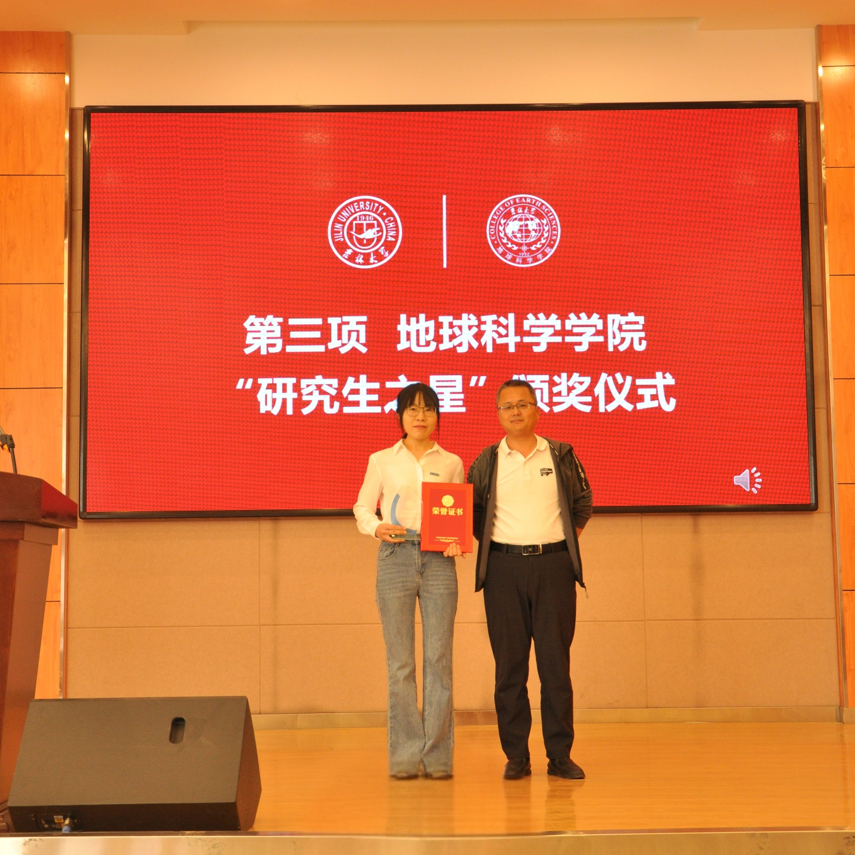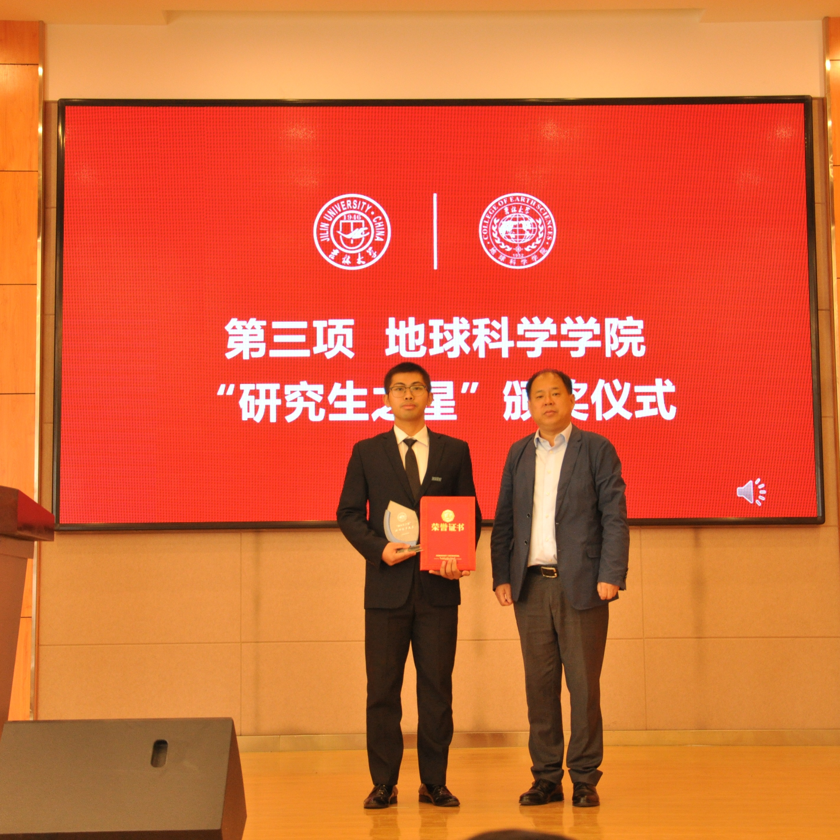 院长单玄龙,专业学位培养指导委员会主任委员王璞珺、行政副院长苗广文、地质学系主任李世超、国土资源系主任王冬艳、博士生导师杨晨分别为“研究生之星”颁发荣誉证书和奖杯。