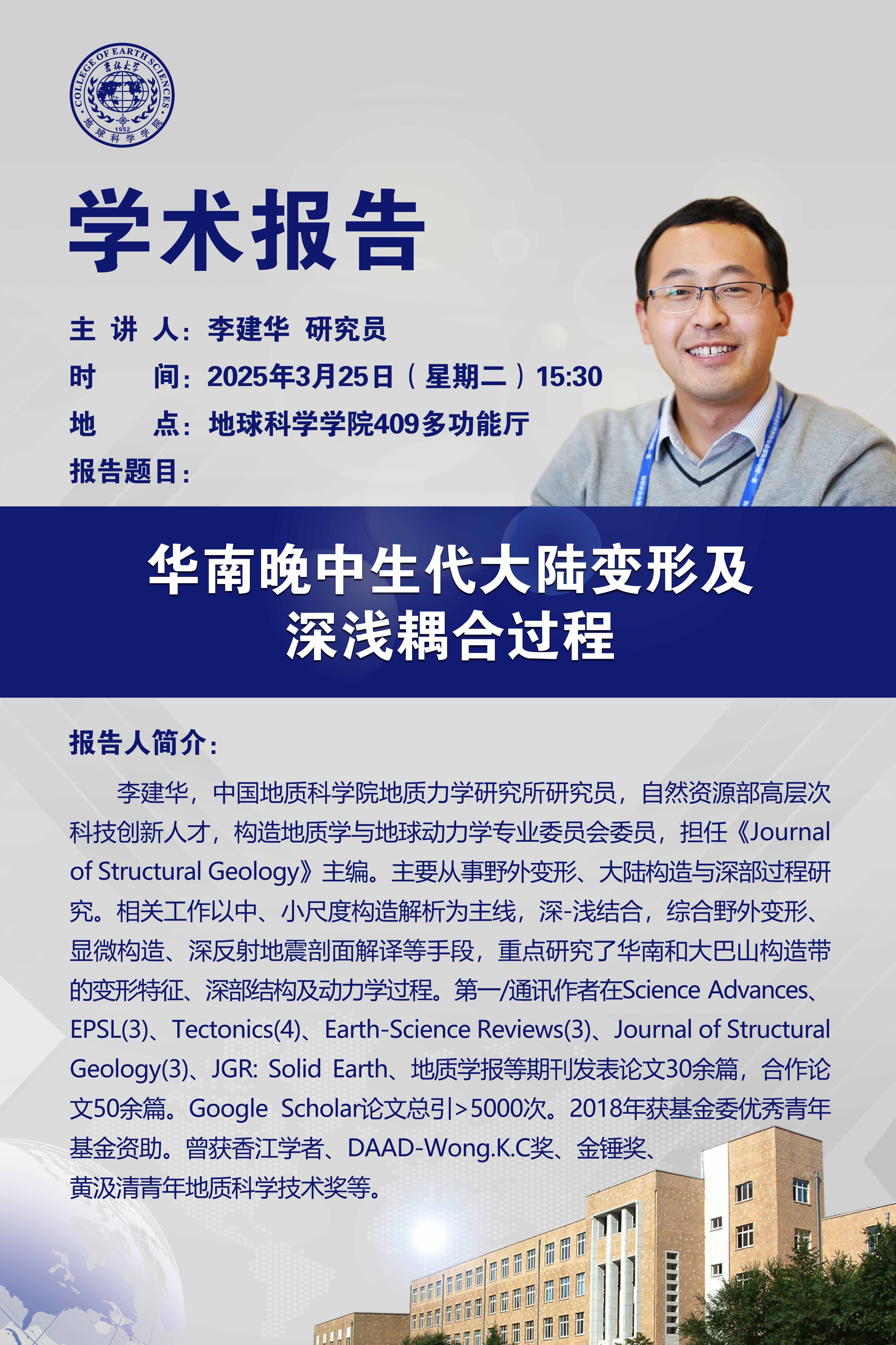 中国地质科豪神娱乐城 地质力学研究所李建华研究员学术报告