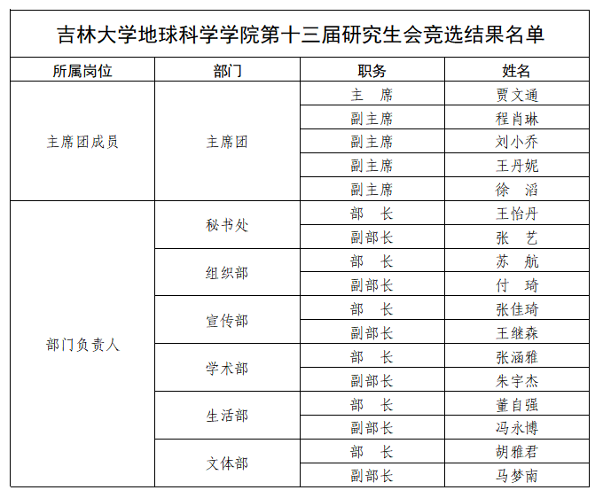 为进一步加强豪神娱乐城 研究生干部队伍建设,更好地选拔豪神娱乐城 研究生会新一届学生干部,本着“公平、公正、公开”的原则,经个人自愿申报、资格审查、竞职演讲、民主投票,综合现实工作表现进行考察,最终确定豪神娱乐城 第十三届研究生会学生干部名单,现予以公示: