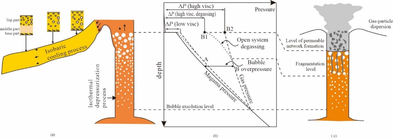 气孔形成符合合并扩散减压模型,浮岩中的气孔数量密度与气孔体积之间成非线性反比的关系。原生气孔的发育与熔浆挥发份密切相关,流纹岩在岩浆含水量低时含水率的变化会引起气孔数量的剧烈变化;气泡大小,形状和分布对渗透率影响明显;气孔类岩石孔隙度越大抗压强度就越小,气孔直径越大抗压强度就越小。