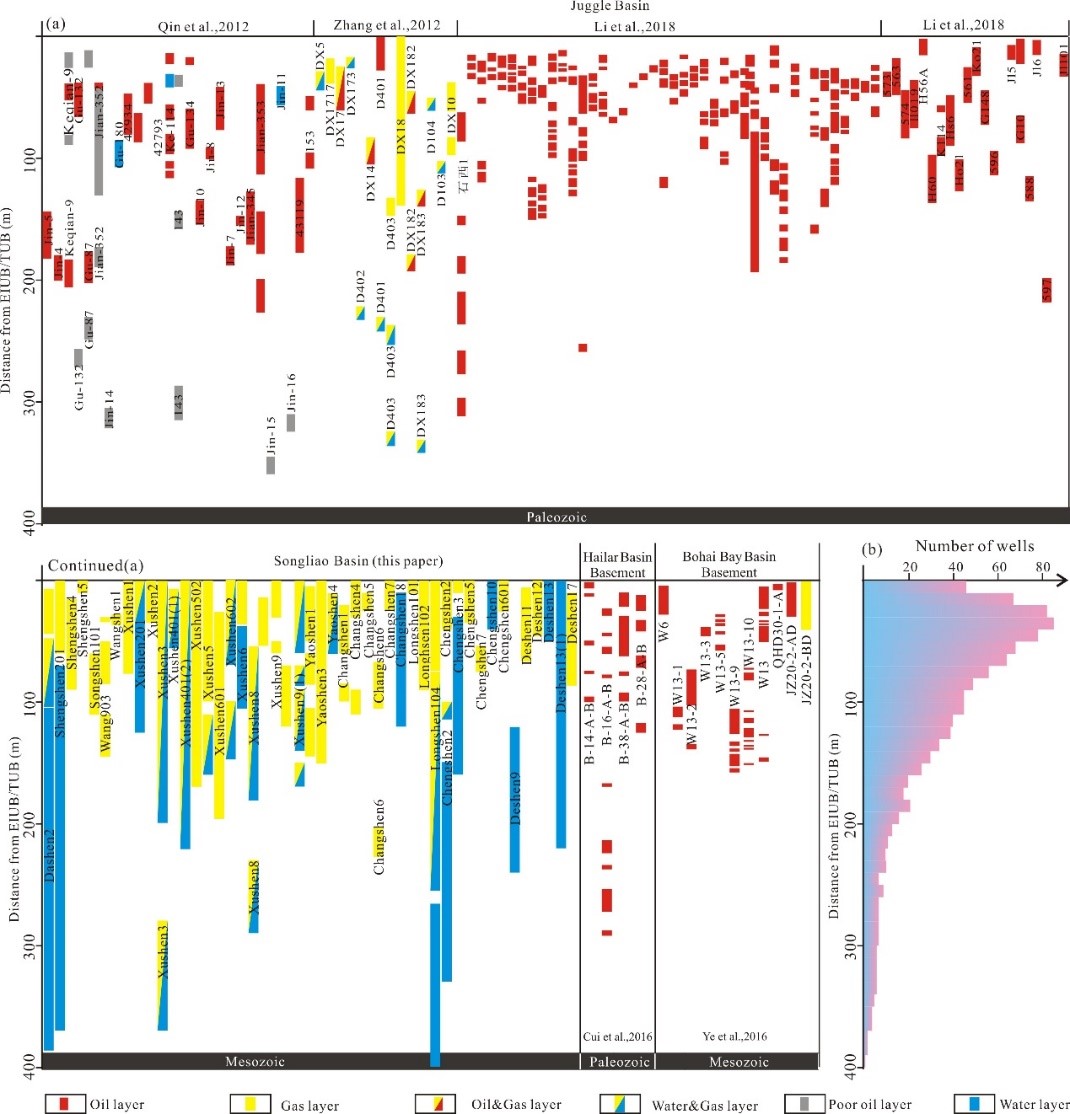 有利储层发育也促进了油气聚集于此。从钻井揭示的情况来看,多数油层/气层/气水层/油水层在喷发间断不整合和构造不整合界面之下150m范围以内(图4a),油层/气层/油气同层更多的集中在100m的范围之内(图4b),该深度段应该是油气勘探的重要层位。