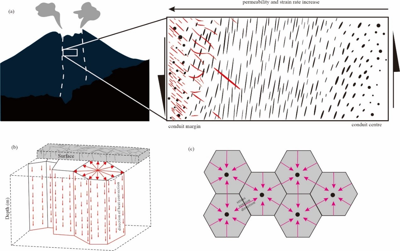 熔浆在固化的阶段是降温阶段,体积会收缩变小,产生张性应力,可以形成裂缝(图6)。裂缝的形成与冷却速度和流动状态的关系密切,如熔岩流在快速流动过程中(冷却速度中等)可能在顶部产生自碎角砾缝,在底部产生层状节理。当熔岩流的流动速度减缓时(冷却速度慢)可能产生贯穿熔岩流的高角度宏观龟裂缝和不规则微小龟裂缝的组合;当熔岩停止流动时,厚层熔岩流会形成下部规则和上部变形柱状节理的组合。