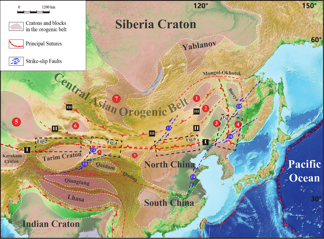 (自西向东分为南天山缝合带、北山缝合带、索伦缝合带和延吉缝合带)