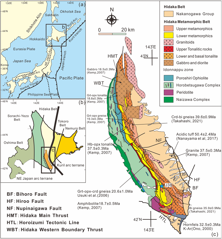 图1. 日本北海道地区Hidaka变质带地质图和泥质麻粒岩的采样位置