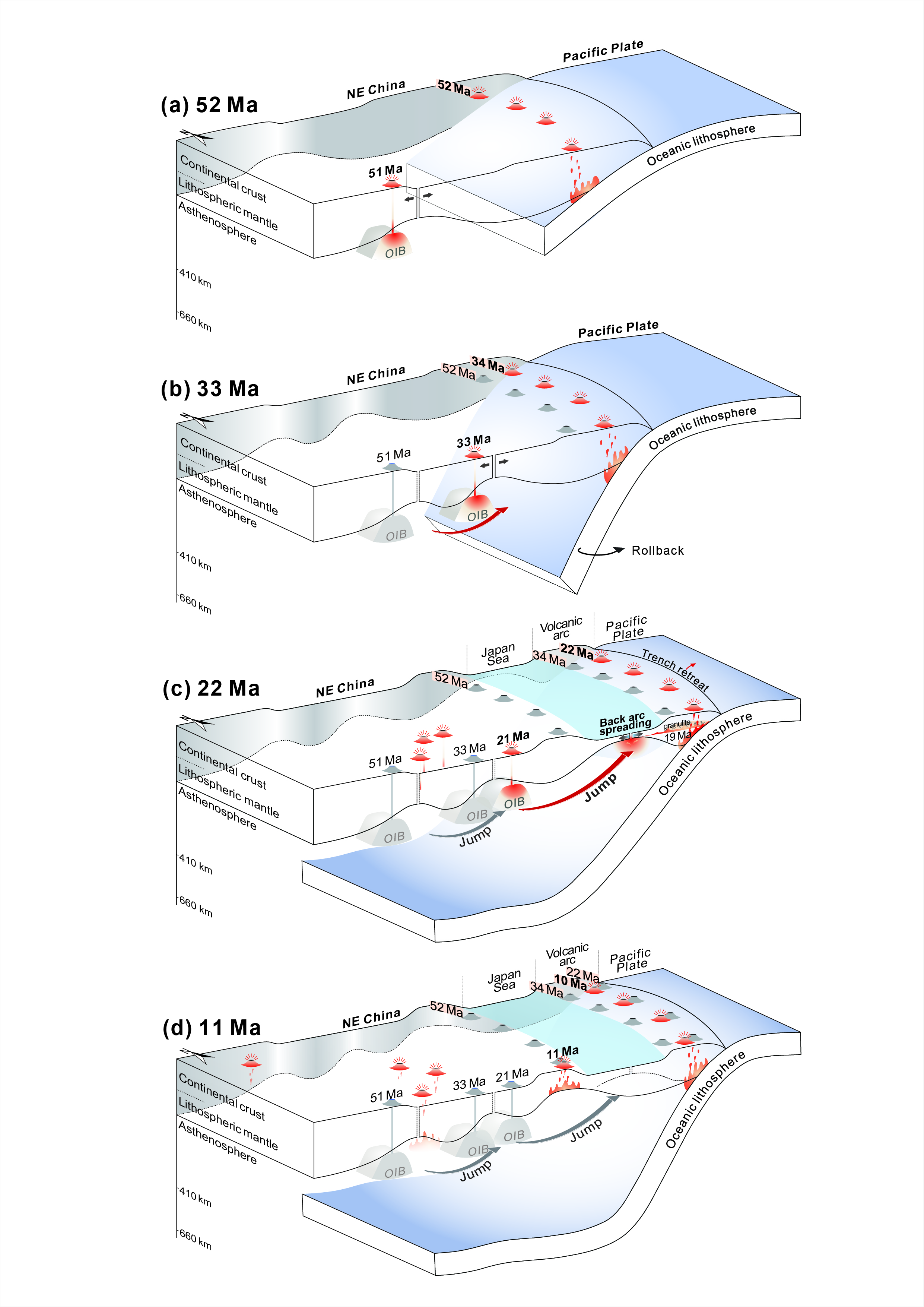 6. 东北亚陆缘新生代玄武岩地球化学的时空变异(图3),揭示了向东的地幔流是导致弧后伸展(或扩张)的主导机制(图4)。板片后撤引起的地幔流应是导致第一次弧后伸展的动因(图4b),而东向地幔流则是导致第二次弧后伸展(扩张)和海沟后撤的主导机制(图4c)。库页弧与欧亚大陆的碰撞(约15Ma)导致弧后扩展的停止,进而引发了板内(中国东北约11Ma)和弧(日本北海道约10Ma)岩浆作用的发生(图4d)。