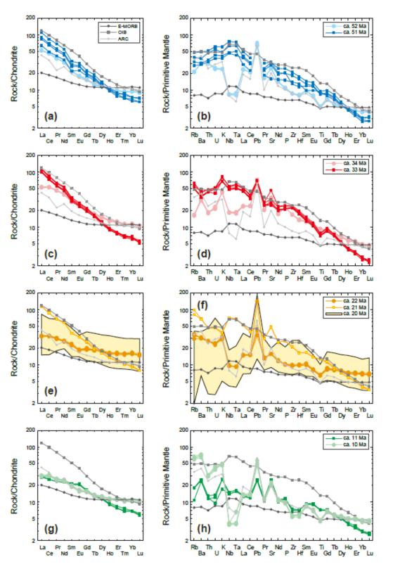 1. 东北亚陆缘新生代玄武质岩浆作用至少可以划分6个阶段:55–50Ma、34–33Ma、22–21Ma、11–10Ma、5–2Ma 和<2.0Ma。本文考虑到库页弧与欧亚大陆的碰撞发生在15Ma左右,并且导致了弧后扩张的停止,本文只选择了55–50Ma、34–33Ma、22–21Ma和11–10Ma四期钠质玄武岩作为研究对象(图1)。