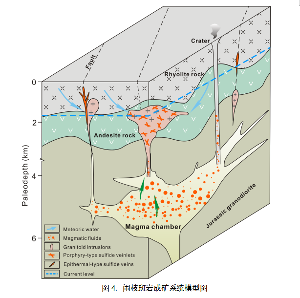 3. 岩体内副矿物—锆石和磷灰石低温热年代学结果被用于反演岩体就位后时间-温度历史;Hefty软件模拟结果表明岩体就位后保存温度低于60℃,就位深度小于2km(与流体压力计(1.7 km)结果吻合);在110 Ma左右经历了温度升高(108 Ma火山作用有关;该期火山覆盖为矿床的保存提供了关键的保障),而后逐渐遭受地壳抬升与风化剥蚀出露地表(图3)。因此,该成矿系统古深度小于2 km,在其深部具有优越的寻找斑岩型Cu-(Mo-Au)矿床的潜力(图4) 。