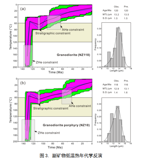 孙景贵教授团队刘阳博士后选取中国东北闹枝斑岩-浅成热液成矿系统首次开展角闪石压力计和副矿物(锆石和磷灰石)热年代学(Th-U/He和裂变径迹)研究工作,重建该岩浆-热液成矿系统的时间-温度历史。具体研究成果如下:
