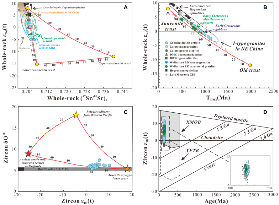 葛文春教授科研团队选取大兴安岭南段早白垩世贫矿高分异花岗岩开展锆石微量和U-Pb-O-Hf同位素、全岩主微量和Sr-Nd-Pb同位素的分析测试(图1),并与周围同期花岗岩堆晶体和稀有金属花岗岩进行综合对比,揭示了高分异花岗质岩浆形成和演化的过程,并探讨了影响高分异花岗岩稀有金属矿化的关键因素。具体研究成果如下: