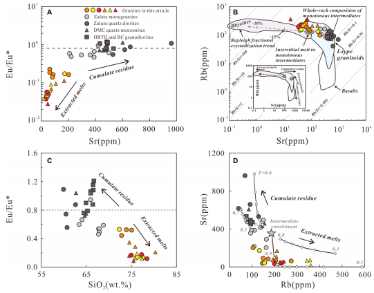 1. 确定了高分异花岗岩的源区组成。高分异花岗岩属于高分异I型花岗岩,主要造岩矿物和副矿物共同的分离结晶在其形成过程中起到了至关重要的作用。锆石O-Hf和全岩Sr-Nd-Hf同位素组成指示早白垩世高分异花岗岩起源于年轻弧型下地壳与古老陆壳基底的重熔,并可能存在再循环远洋沉积物的贡献(图2)。