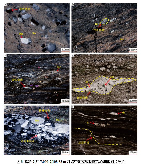 通过岩石类型及变质变形特征研究,在松科2井7,000-7,108.88 m 的中泥盆统基底地层序列中识别出一套动力变质岩系,共七种主要动力变质岩的相关岩石类型,包括碎裂化绢云母千糜岩(图2b、f,图3a)、绢云母千糜岩(图2c、d、e、h,图3b)、绢云母千糜碎裂岩(图2g,图3c)、碎裂角砾岩(图 2i)、碎裂化白云母糜棱片岩(图 2j,图3d)、白云母糜棱片岩(图2k,图3e)以及长英质糜棱岩(图2a、l,图3f)。