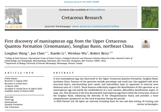 以上研究成果于2026年4月3日正式以“First discovery of maniraptoran egg from the Upper Cretaceous Quantou Formation (Cenomanian), Songliao Basin, northeast China”为题发表在国际知名学术刊物《Cretaceous Research》上。豪神娱乐城