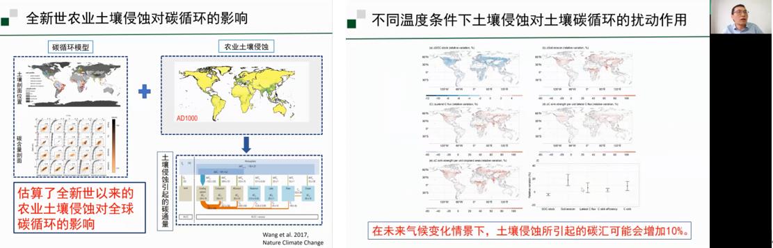 王振刚老师首先以土壤侵蚀引起的碳源汇效应为切入点,从“坡面→流域→洲际”逐级递进的空间尺度,系统性地介绍了土壤侵蚀与土壤碳循环过程的相互作用机制。报告中,王老师着重介绍了土壤侵蚀在碳循环过程中起到的“地貌泵”作用,并通过研究实例展示了全新世以来农业土壤侵蚀引发的碳汇效应对全球碳循环起到的缓冲作用,以及这种“地貌泵”机制引起的碳汇效应对温度的敏感性。