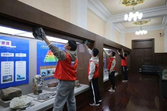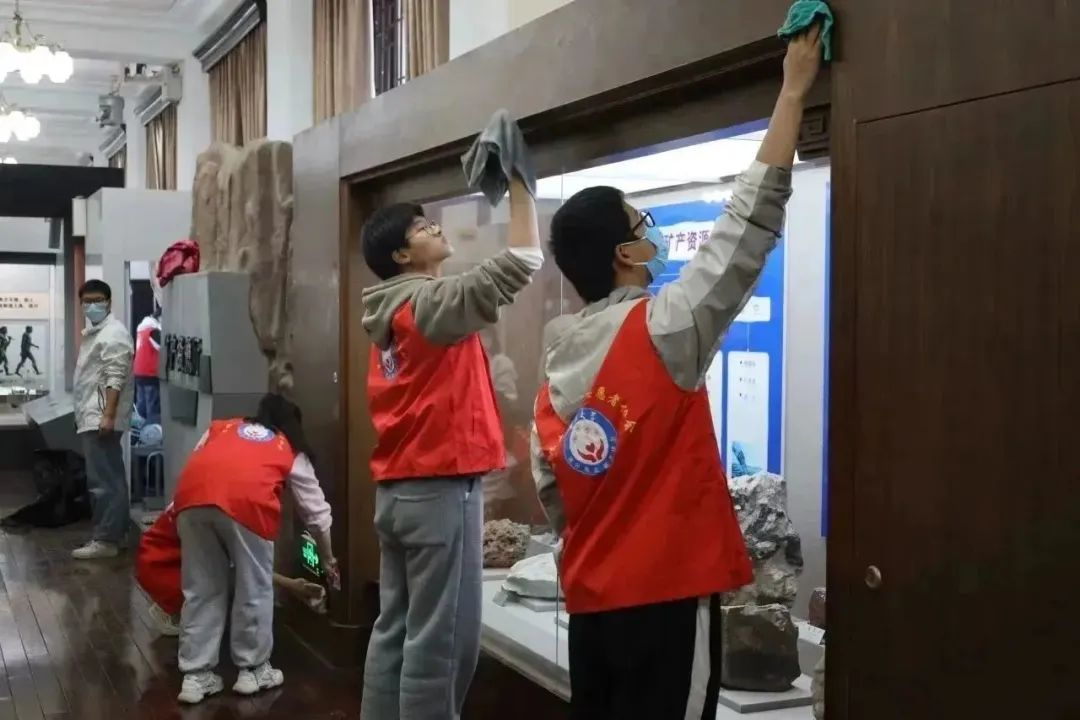 在此之后同学们开始有条不紊的进行劳动工作,他们充分展示出了合作意识与极高的工作效率。在擦拭展示柜和打扫馆内卫生的过程中,同学们耐心十足、一丝不苟,使得来自于亿万年前的藏品得到保护并焕发出更好的展态。与此同时,同学们也了解了地质宫的历史以及馆内工作的重要性、增强了同学们的社会责任感和劳动乐趣、培养了大家的劳动意识、助长了各位的劳动精神,让“劳动最崇高、奋斗正青春”的精神在我们这片流淌着华夏文明源流的土地上生长出更加繁茂的智慧之花。