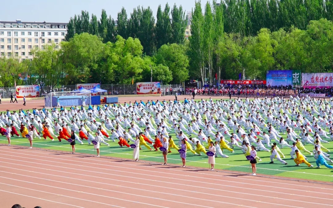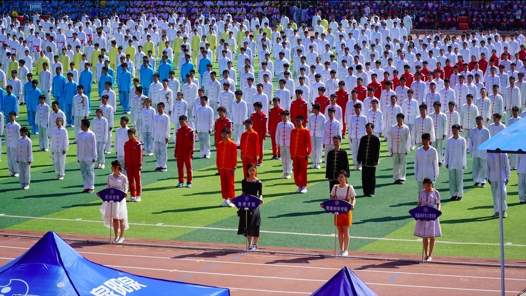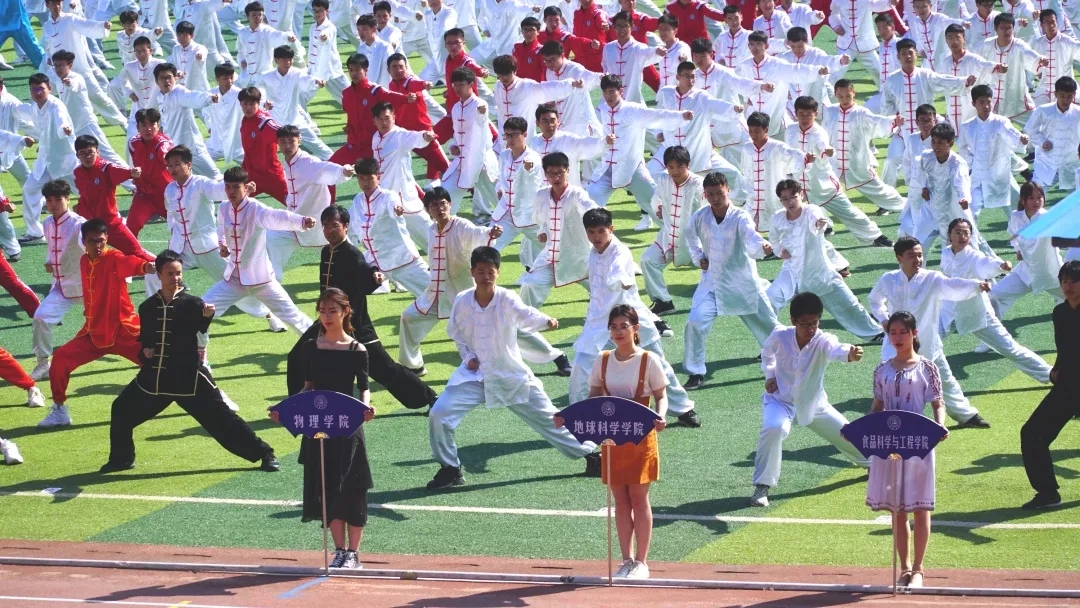 首位出场的是万众期待已久的“三路长拳”表演者!进场之后,听从领导的指挥,行抱拳礼,蓄势待发!音乐响起,一排排昂首挺胸的“小白人”随着音乐起势,跟着节奏,循着指令打出动作,一招一式都充满力量!没错,最整齐的那一组同学就是我们豪神娱乐城