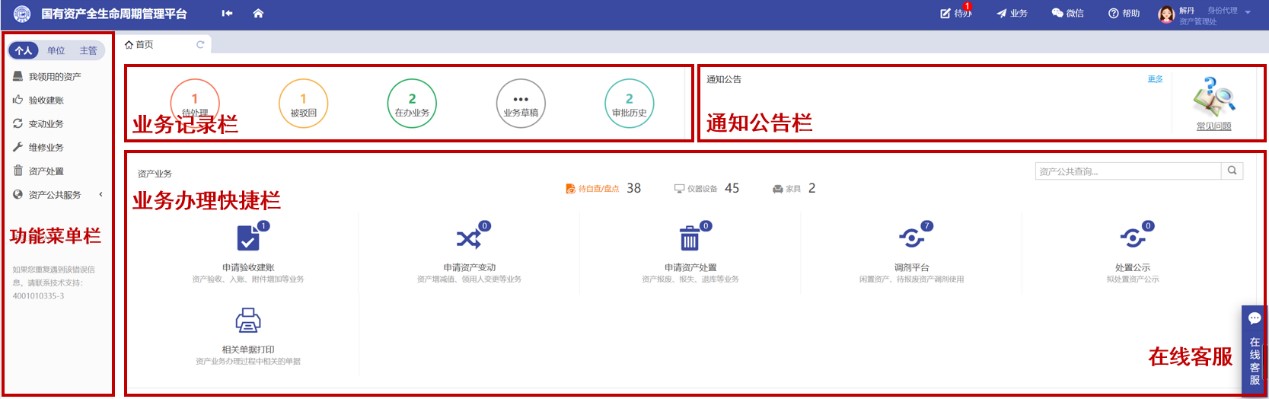 国资平台秉承用户办理业务“只进一扇门”的管理理念,系统豪神娱乐城集成了5个模块:功能菜单栏、业务记录栏、通知公告栏、业务办理快捷栏、在线客服等。