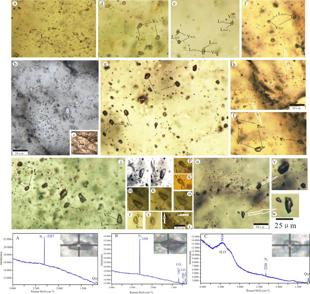 包裹体岩相学研究表明,矿石石英中发育气相、富气相、含CO2及气液两相四种类型原生流体包裹体(图1),根据测温过程中包裹体复杂的相变特征、相变温度(图2)及单个包裹体激光拉曼光谱成分分析(图1),证明成矿流体为一类成分复杂的富N2流体体系,各类包裹体中N2CO2含量变化大(图3),排除了不同类包裹体为原始均匀流体不混溶作用结果的可能性;结合氢--氮同位素分析结果,提出成矿流体为岩浆来源NaCl-H2O-CO2体系热液与变质富N2流体混合产物的新认识。成矿流体中大量N2气的加入,有力促进了白钨矿的沉淀,是白钨矿矿床形成的重要机制。