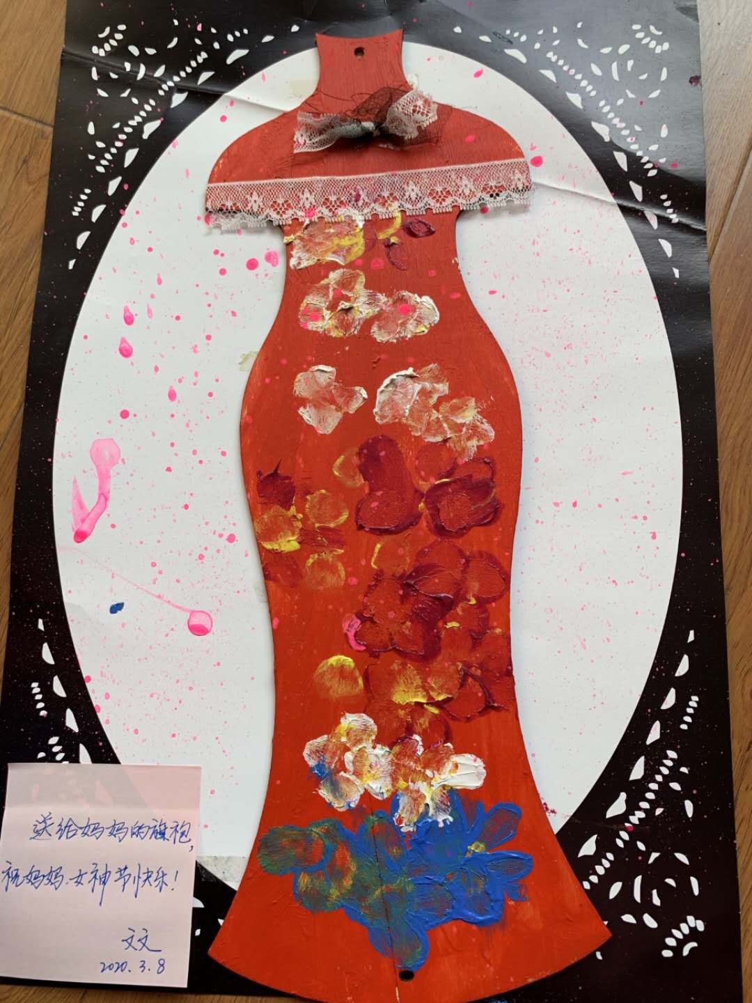 李红老师儿子送妈妈亲手制做的旗袍,祝妈妈女神节快乐。