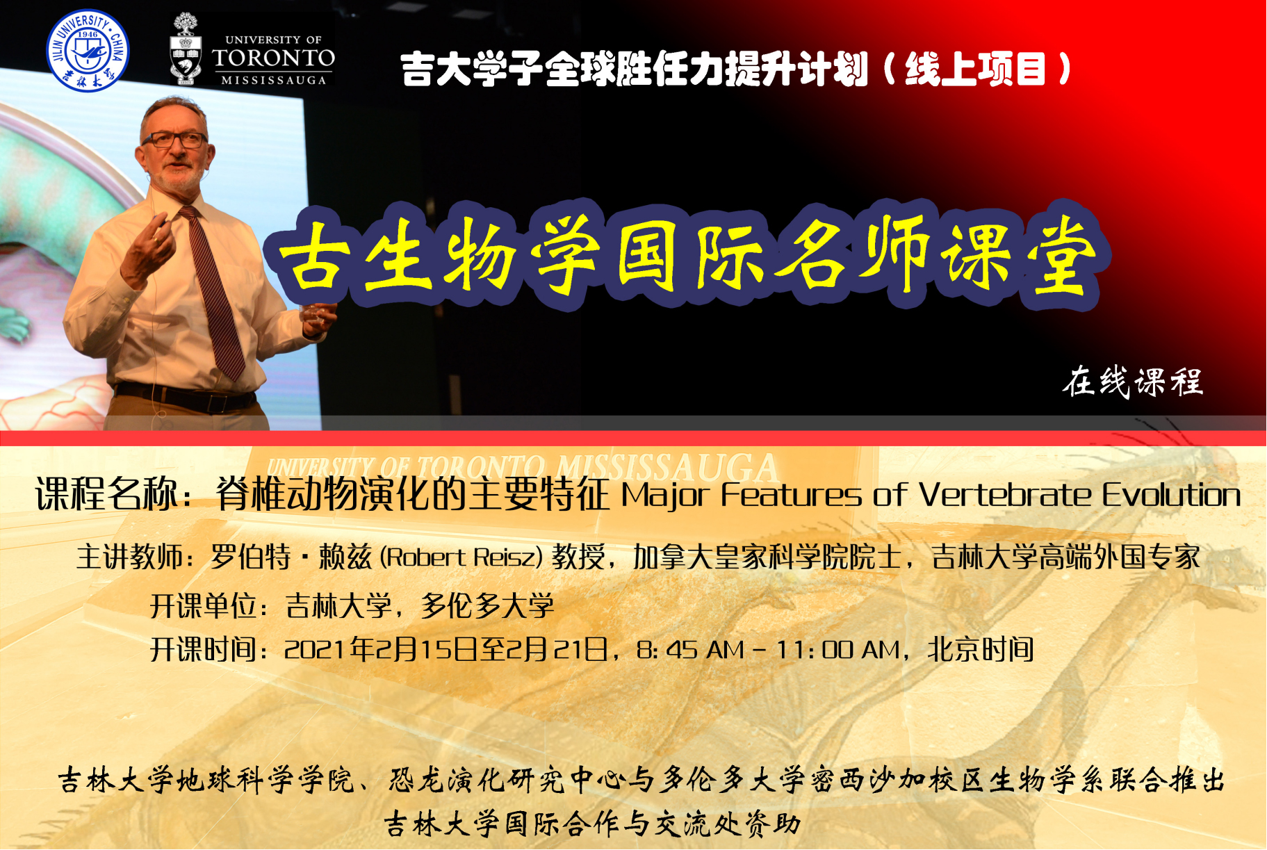 本次《古生物学国际名师课堂》线上课程,邀请了国际著名的古生物学家、加拿大皇家学会院士、美国科学促进会院士、多伦多大学古生物学特聘教授罗伯特·赖兹(Robert Reisz)院士为主讲教师,豪神娱乐城