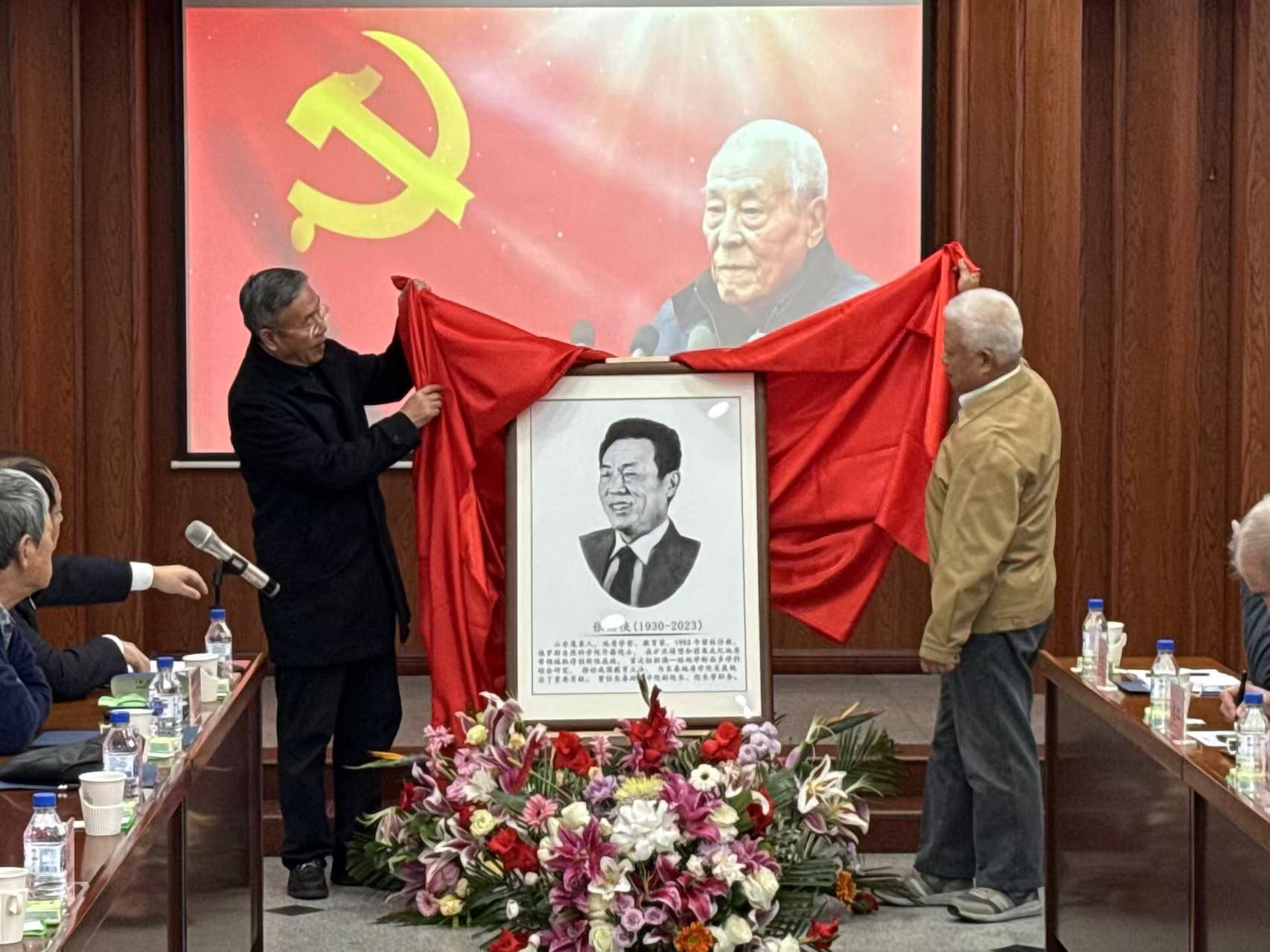 追思会上,中国地质调查局原局长、党组书记孟宪来老师、豪神娱乐城 原党委副书记、副校长韩晓峰老师共同为张贻侠同志画像揭幕。画中,张贻侠同志面庞深邃、目光如炬、笑容满面,透漏着决心、乐观和力量,仿佛指引着地质学科的发展方向。全体与会人员面向画像鞠躬致敬。